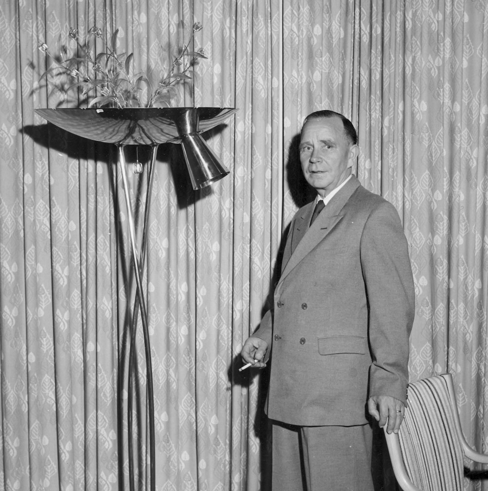 More monumental, the chandelier designed for the Myllykoski Paper Mill around 1945 transforms light into architecture. Only six were ever produced, each a bespoke commission that speaks to Tynell’s mastery of proportion and his understanding of space. Hanging above workers and visitors, it turned an industrial hall into a cathedral of light.