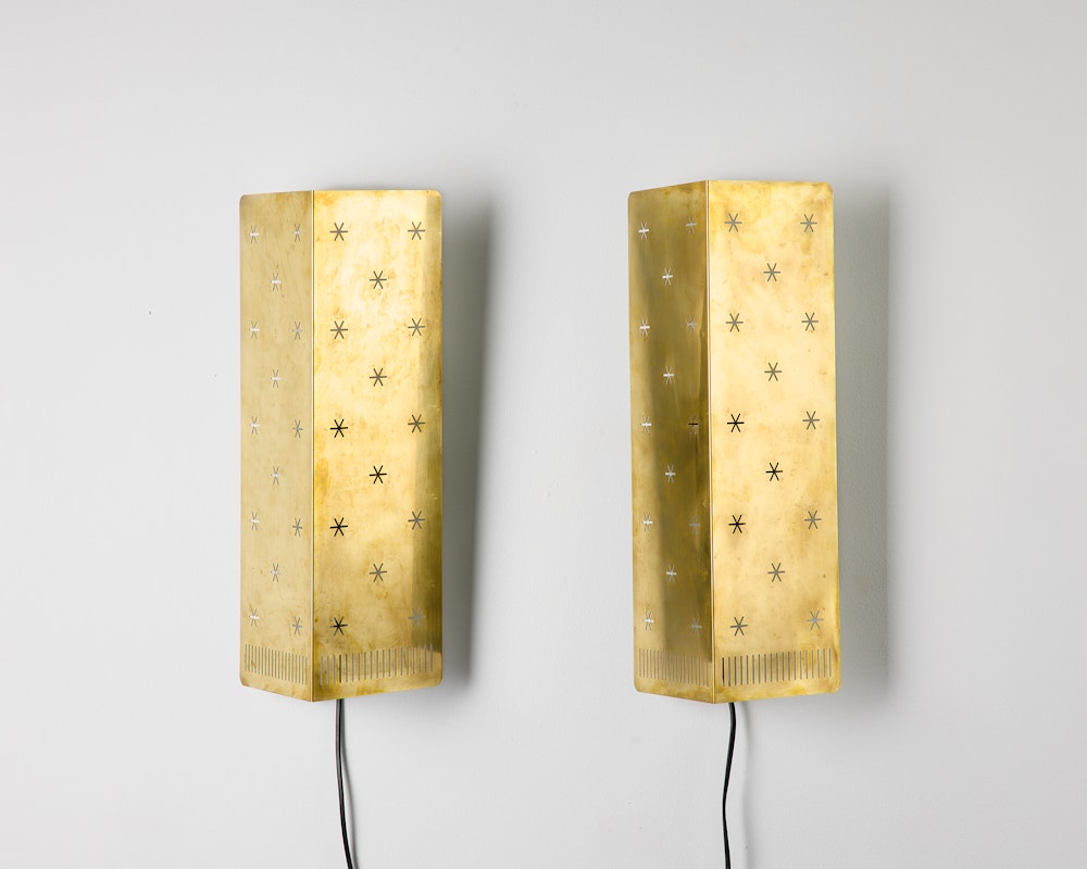 By contrast, the Pair of Wall Lamps 6200 distil that generosity into intimate form. Their simplicity — polished brass, perforated shades — belies the skill of their composition. The light they cast is not directional but ambient, spreading softly across the wall.