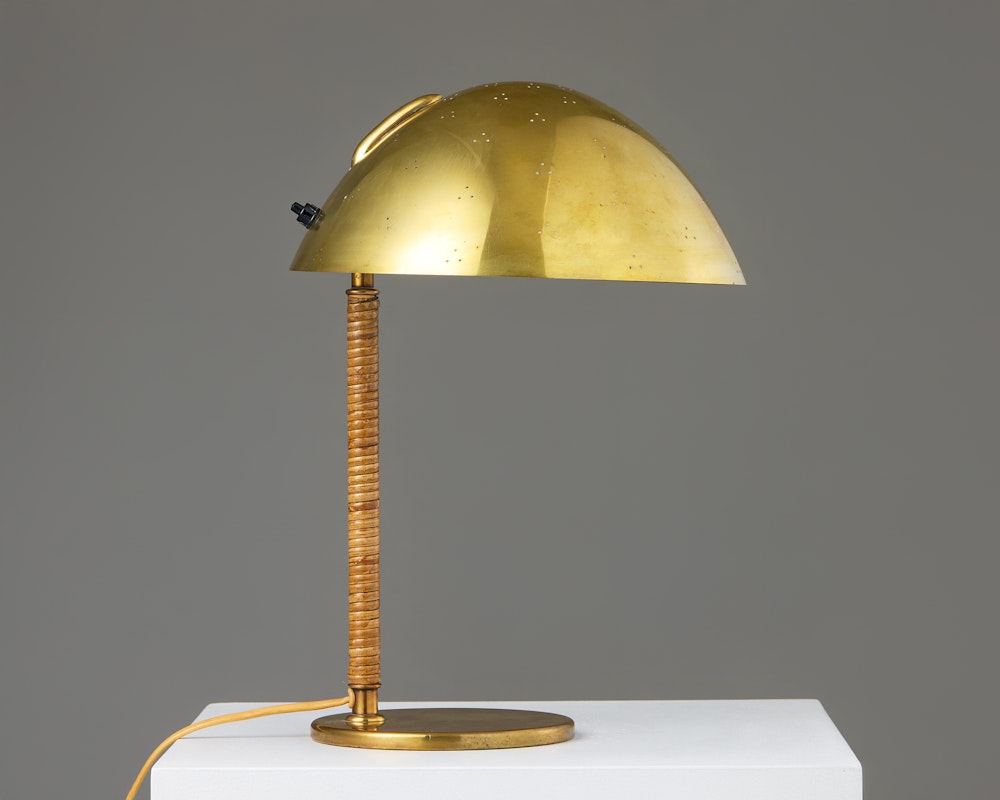Finally, the Helmet Table Lamp 9209, with its curved brass dome and leather-wrapped stem, returns to intimacy. Designed in 1950, it embodies the warmth that made Tynell’s work so beloved. The perforations around the dome’s edge scatter small rings of light, echoing the stars of a northern sky — a reminder that even in darkness, beauty can be found in restraint.