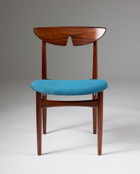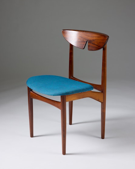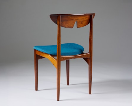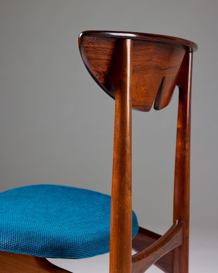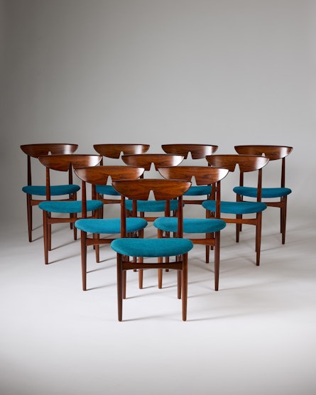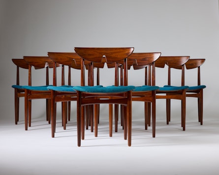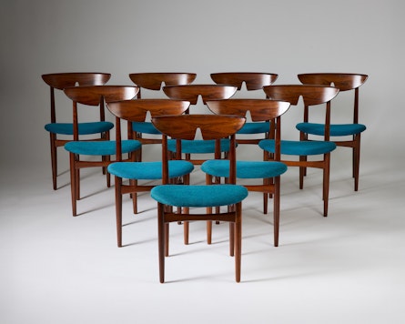 A set of ten rosewood dining chairs designed by Kurt Østervig in Denmark during the 1960s. Crafted from richly grained rosewood, the chairs embody the harmony of sculptural form and functional elegance that characterises Scandinavian modern design. The gently curved, moulded backrests offer both comfort and visual rhythm, while the turquoise wool upholstery provides a refined contrast to the depth of the wood.