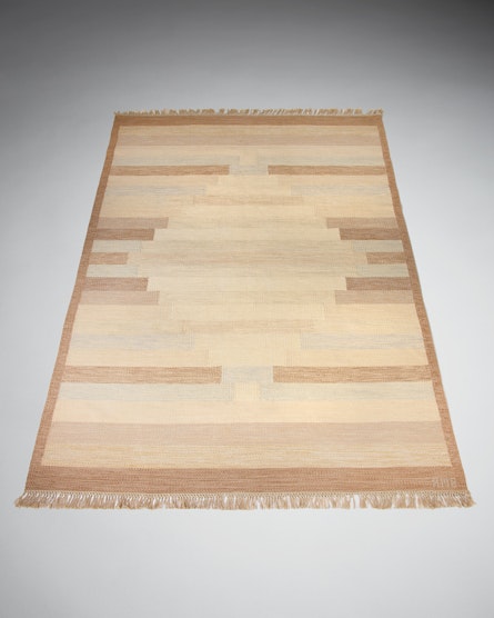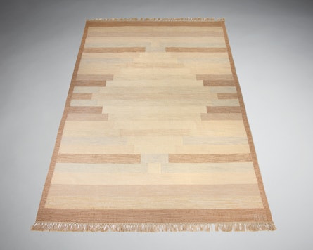 The ‘Prisma’ carpet by Anne-Marie Boberg exemplifies the harmonious geometry and balanced color palette characteristic of late 20th-century Scandinavian textile design. Woven in Sweden during the 1980–90s, the rug features a refined composition of interlocking rectangular forms in warm neutral tones, creating a subtle play of depth and symmetry.