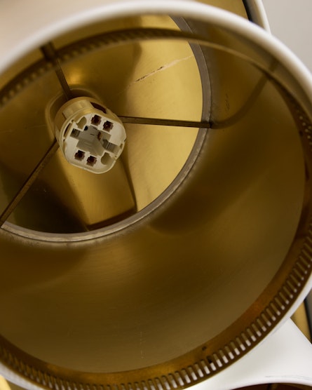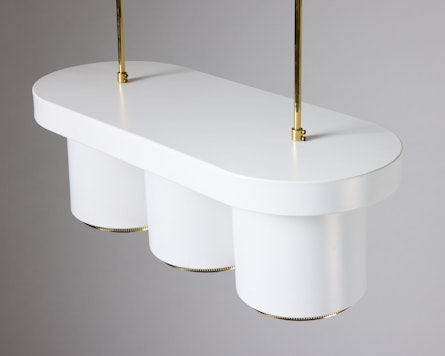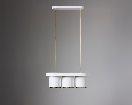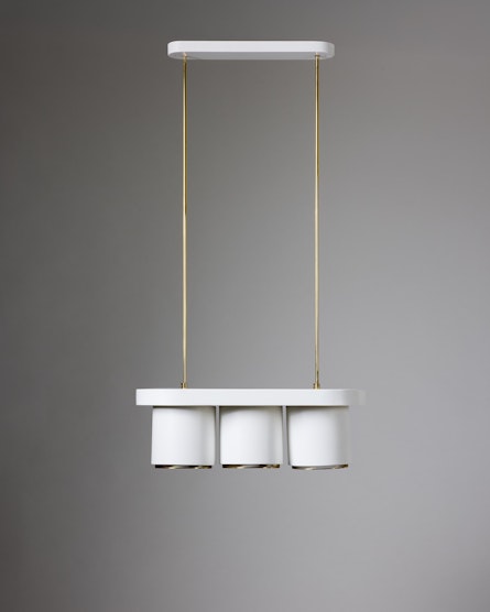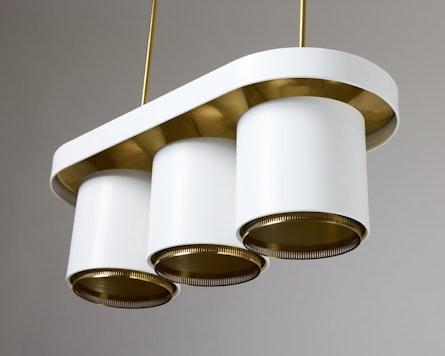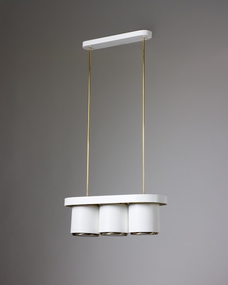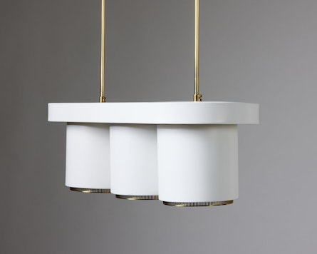 Executed in white lacquered metal with brass fittings, the A203 features three cylindrical shades suspended from an oval canopy. The form reflects Aalto’s ability to balance geometry with softness, a design philosophy visible throughout his architectural work. The lamp’s refined proportions and tactile materiality create a subtle interplay of light and structure, evoking the organic warmth that defines Finnish modernism.