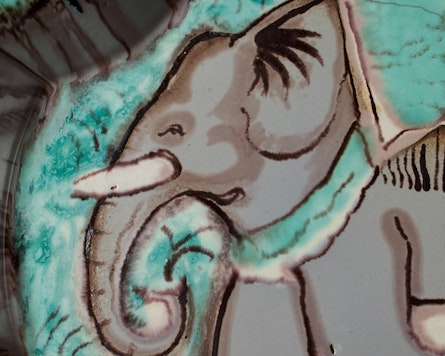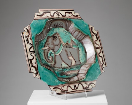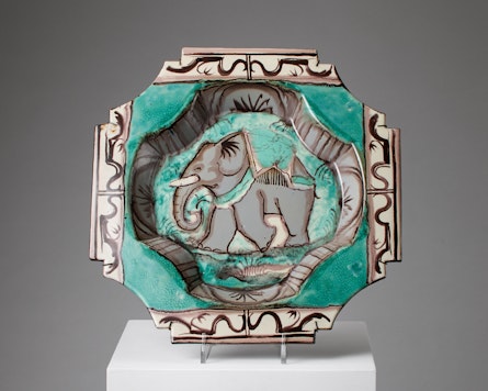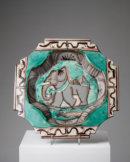 At the centre, a sculpted elephant in low relief moves across a stylised landscape, its form outlined in dark slip and surrounded by a halo of turquoise and sea-green glaze. The background shifts between green, grey, beige and brown, creating depth and a subtle sense of movement in the surface. The stepped edges are decorated with graphic scrolls that echo classical and oriental influences, a hallmark of Ebeling’s eclectic visual language.