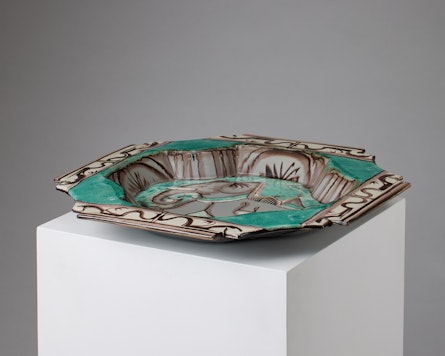Created during his brief but important tenure at Upsala-Ekeby, this hand-glazed platter brings together sculpture, painting and design, and stands as a rare collector’s piece within Swedish studio ceramics of the early 20th century.