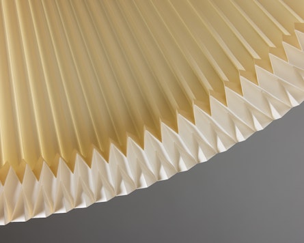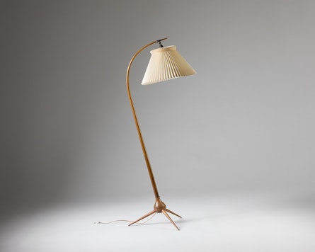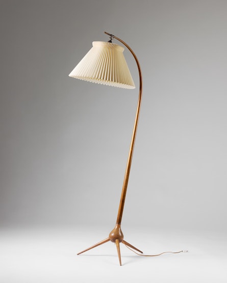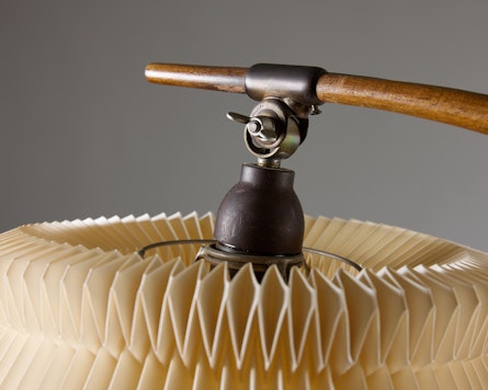 Crafted from beech with brass fittings, the lamp features a slender tripod base with tapered legs that spread outward in perfect balance. It is fitted with the original hand-folded Le Klint pleated lampshade, whose light, conical form enhances the organic flow of the design. The switch is subtly integrated between the tripod legs, allowing convenient foot operation, a detail that combines functionality with timeless elegance.