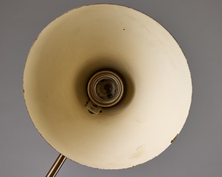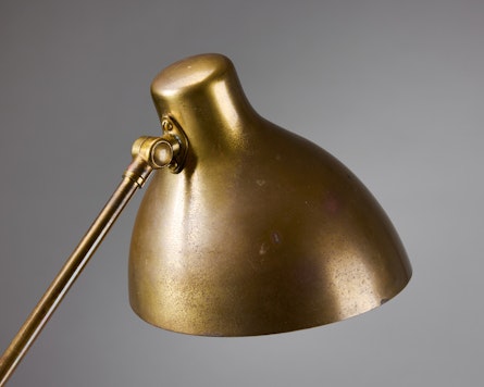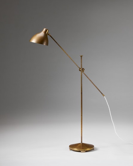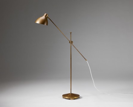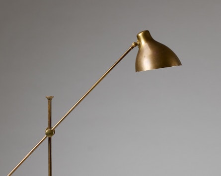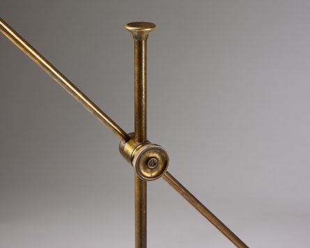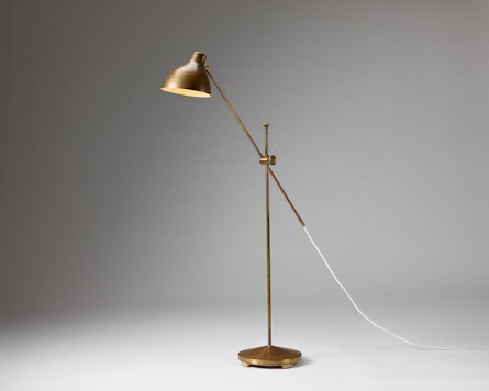 This ASEA brass floor lamp exemplifies the restrained elegance of Swedish mid century lighting. The round, brass clad base conceals an internal iron weight and rests on four discreet low feet, giving the lamp visual lightness while ensuring stability. From this base rises a straight column that supports a slender lateral arm, both elements meeting in adjustable joints that allow the light to be raised, lowered and swung to the side with ease.