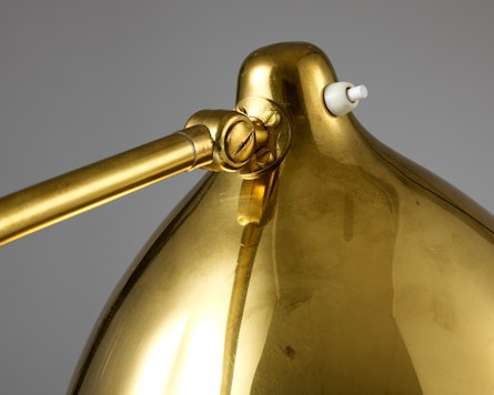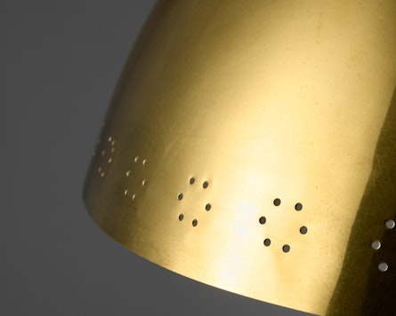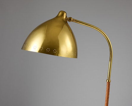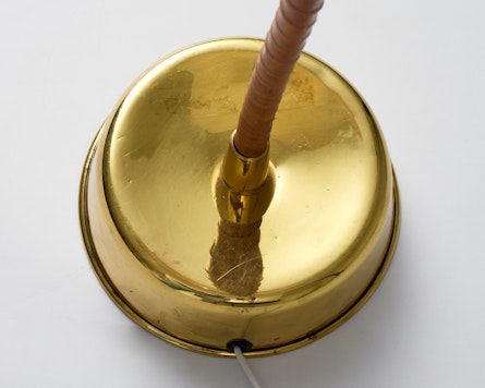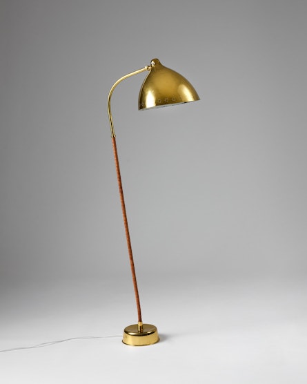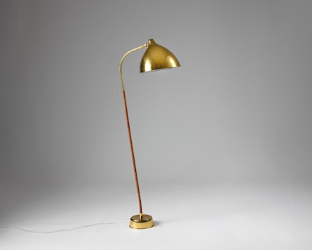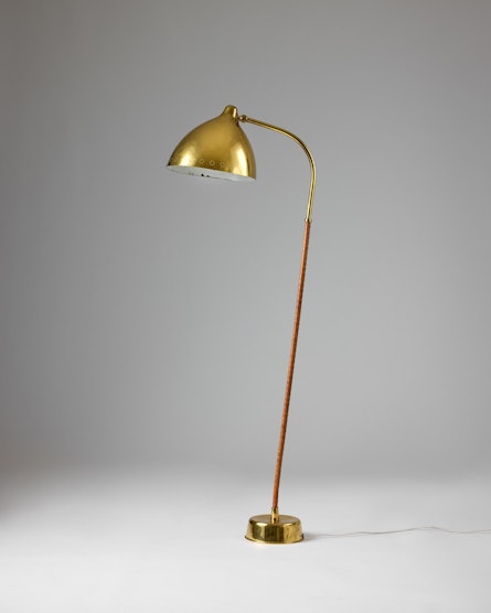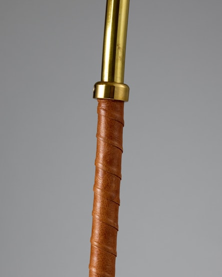This floor lamp by Lisa Johansson-Pope is a timeless designer statement. Featuring a bell-shaped dome in a refined brass finish, this lamp directs light downward with precision and warmth. The stand, wrapped in handcrafted cognac-colored leather, adds a touch of exclusivity and luxury. Part of the renowned Lisa Collection, it seamlessly blends elegant form with functionality — a sophisticated centerpiece that enhances any interior.