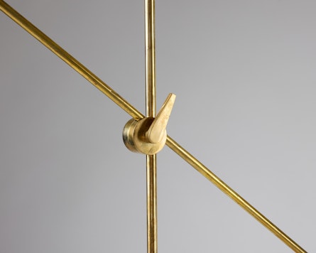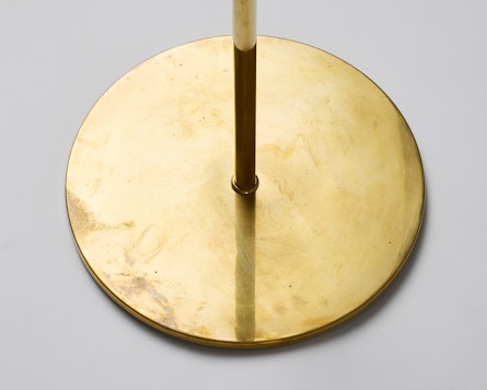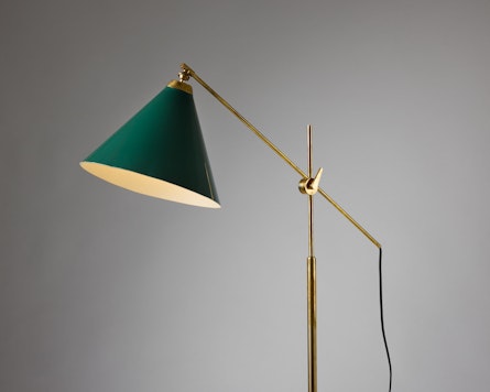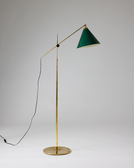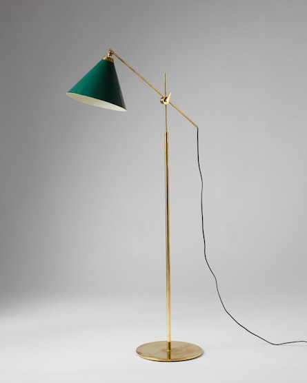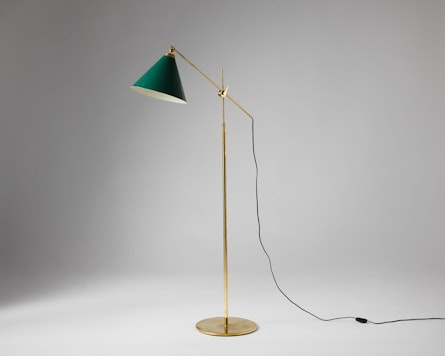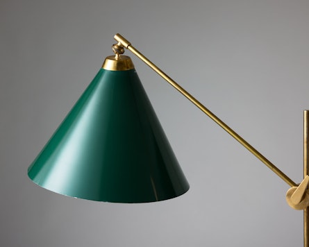 Crafted from brass, but on occasion found in nickle-plated variants, this fully adjustable floor lamp is a perfectly balanced and understated design. The lacquered metal shades can be most commonly found in a deep green colour or with a more delicate white fabric cover. The Danish artist TH. Valentine is an elusive designer, the only trace to be found of them being the stamped initials to the base of each lamp produced by Poul Dinesen.