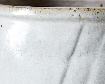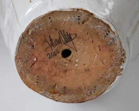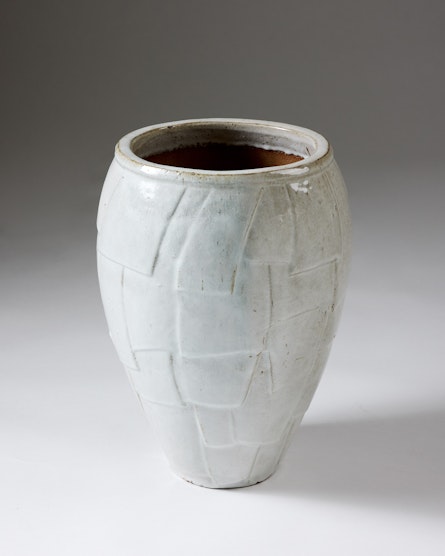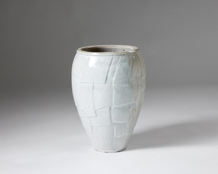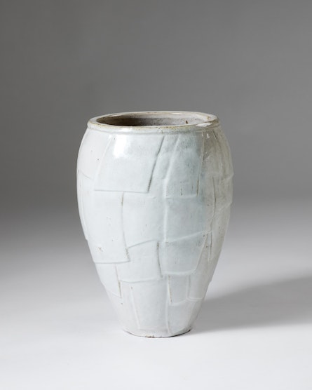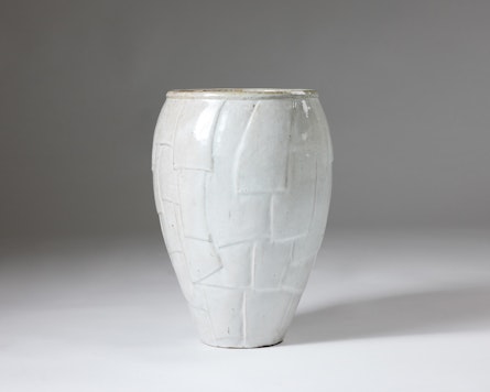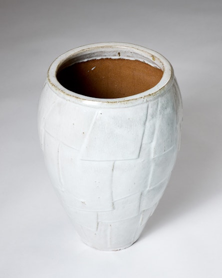 A ceramic floor vase modelled with relief decor. Decorated with white glaze