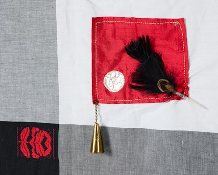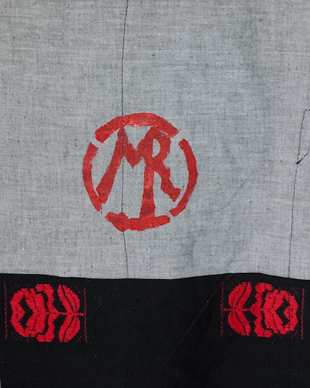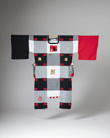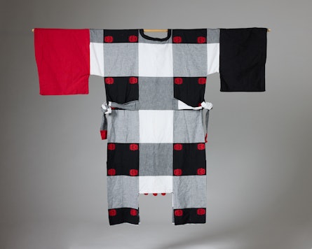 Composed of a patchwork of geometric panels in bold shades of red, black, and grey, the kimono blends fine craftsmanship with conceptual design.