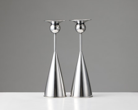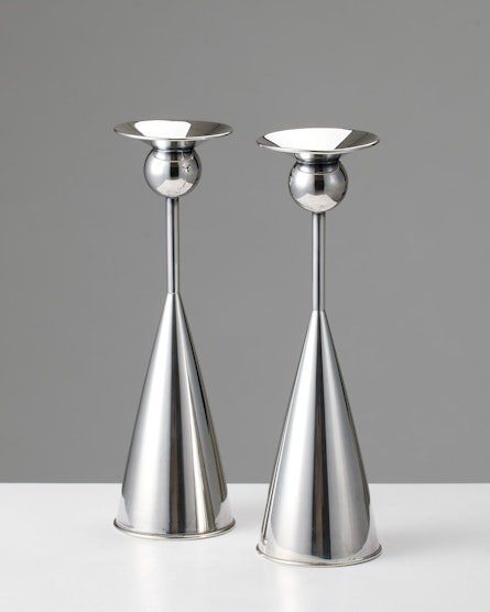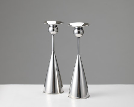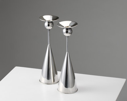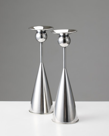 A pair of silver candlesticks designed by Kaj Blomqvist in 1966, exemplifying the refined minimalism and sculptural precision of Finnish modern design. Each candlestick features a striking geometric composition of cone and sphere, balanced with impeccable proportion and craftsmanship. The surfaces display a subtle patina that enhances their depth and historical presence.