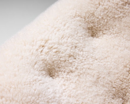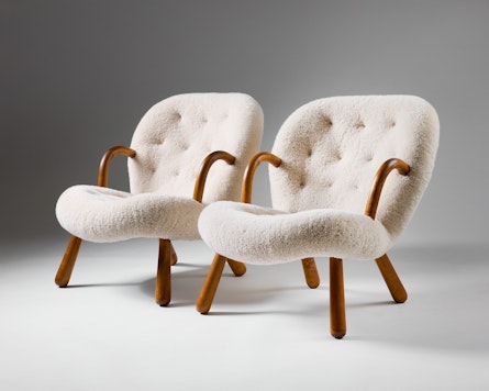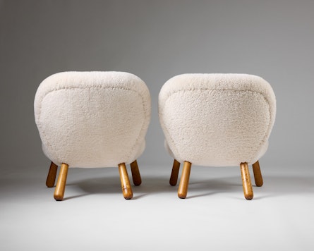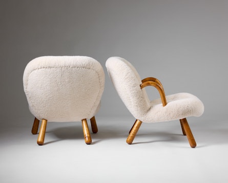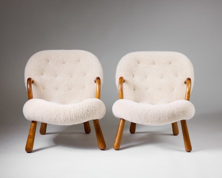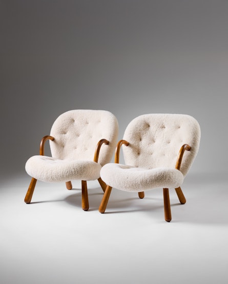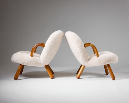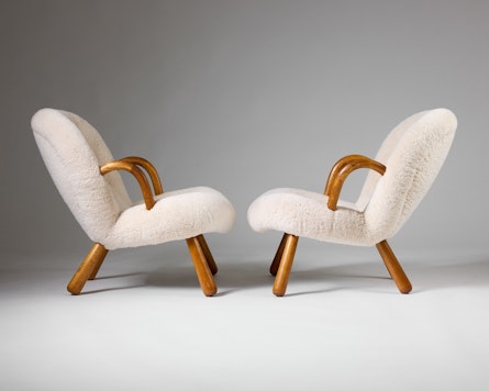 Pair of ‘Clam’ chairs designed by Arnold Madsen for Madsen & Schubell in Denmark during the 1940s. Upholstered in soft natural sheepskin, these chairs are celebrated for their exceptional comfort and instantly recognizable sculptural form.