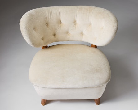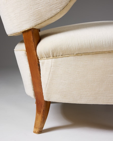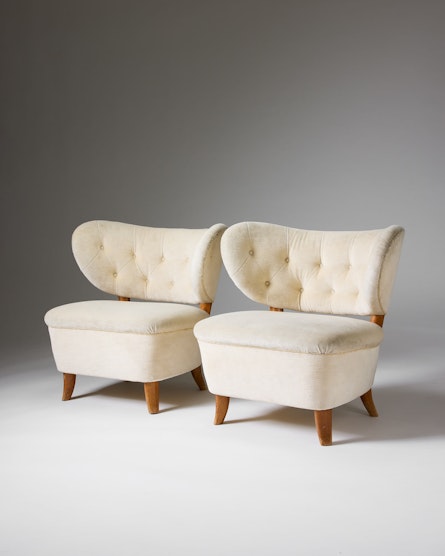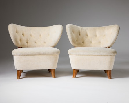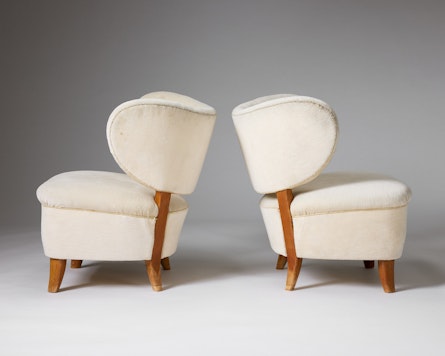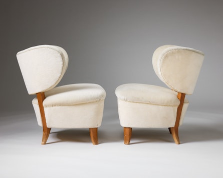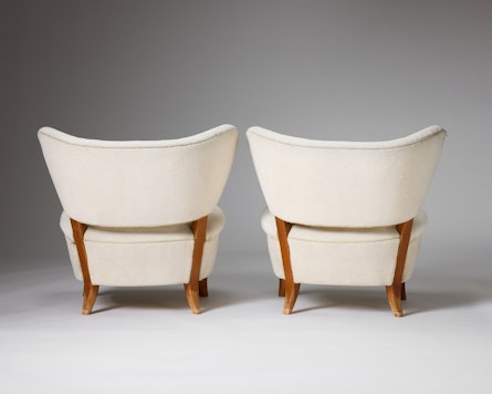 This pair of vintage furniture armchairs is a refined example of Otto Schulz’s distinctive Swedish design. Their sculptural silhouettes, inspired by the antique Greek klismos and Schulz’s own “Sulla” model, are translated into generously scaled, deeply set seats that feel both modern and timeless. The absence of loose cushions allows the continuous sweep of the frames and upholstery to remain visually uninterrupted, which heightens the armchairs’ architectural presence and makes them standout vintage furniture pieces.