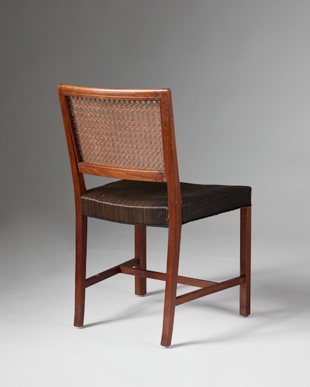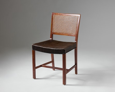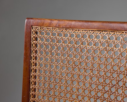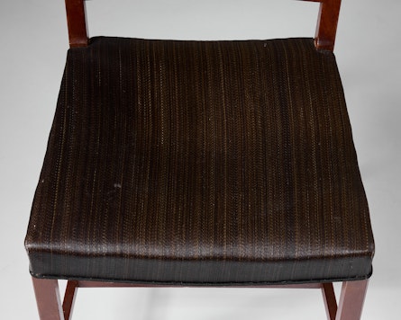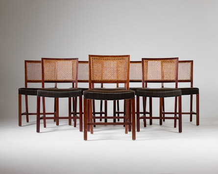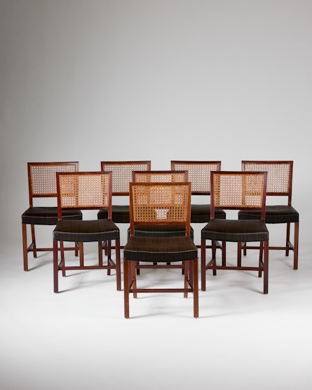 A refined set of eight dining chairs by Danish master cabinetmaker Frits Henningsen, crafted in Denmark during the 1940s. Each chair features a solid mahogany frame with a handwoven French cane backrest, showcasing Henningsen’s impeccable attention to proportion, craftsmanship, and material harmony. The seats are upholstered with horsehair, a traditional technique emphasising durability and comfort.