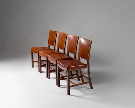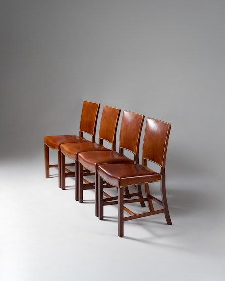 Crafted from rich mahogany, the chairs are upholstered in patinated Niger leather, which has developed a deep, warm tone over time, enhancing the natural beauty of the material. The clean, angular lines of the wooden frame are balanced by the softness and comfort of the leather upholstery. Brass nail head detailing along the edges adds a refined decorative element, highlighting the craftsmanship and attention to detail that characterise Klint’s work.