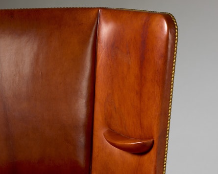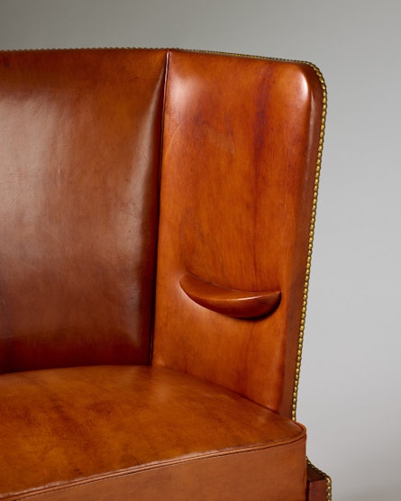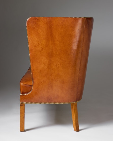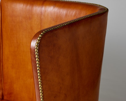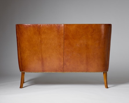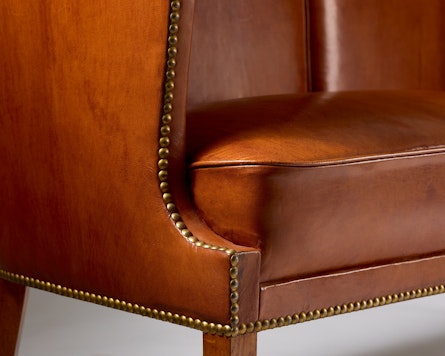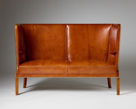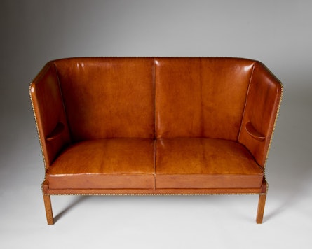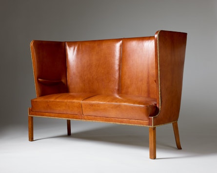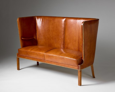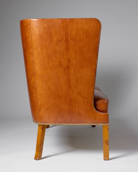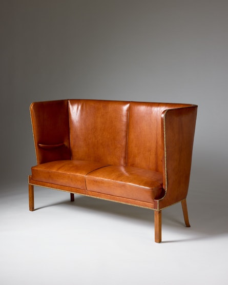 Freestanding two-seater highback sofa. The seat, back, sides, and integrated armrests are upholstered in the patinated Niger leather. The high back and softly curved wings evoke a sense of privacy and enclosure, a form rooted in 18th-century English and French tradition, here reinterpreted with the understated elegance of Danish design.