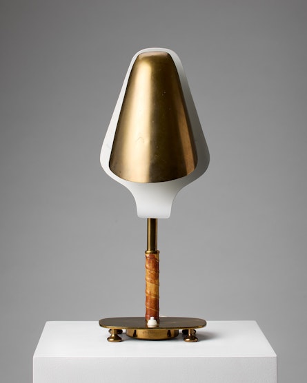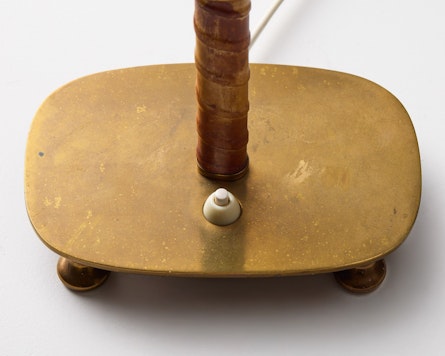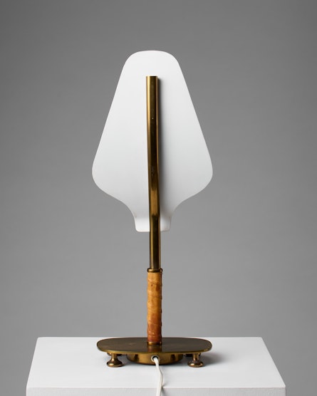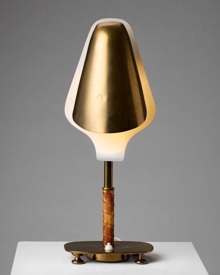 This rare table lamp, model 15582, was produced by Arvid Böhlmarks Lampfabrik in Stockholm during the 1950s and represents an exquisite example of Swedish Modern lighting. Executed in brass with a white-lacquered inner shade and a stem wrapped in leather, the lamp bears the original Böhlmarks stamp and model number. Its sculptural silhouette and refined material palette embody the quiet sophistication that characterises mid-century Scandinavian design.