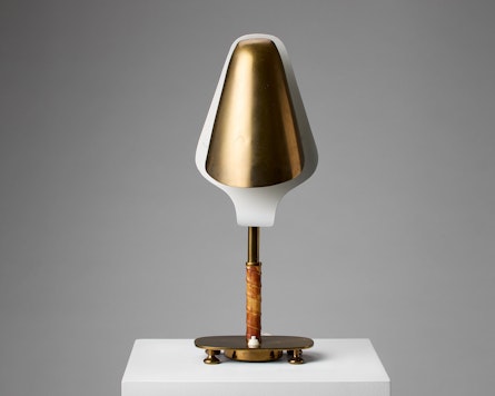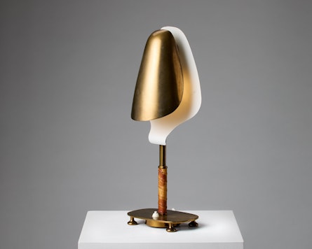Brass, white lacquered inner screen, body in wrapped leather.