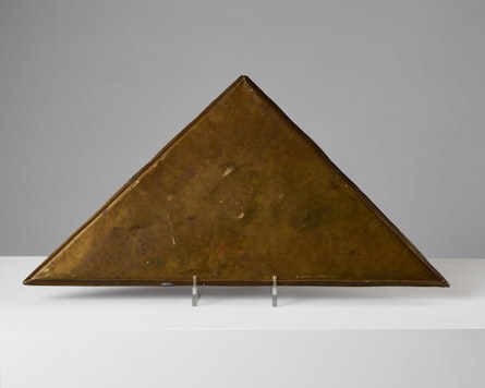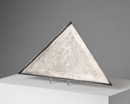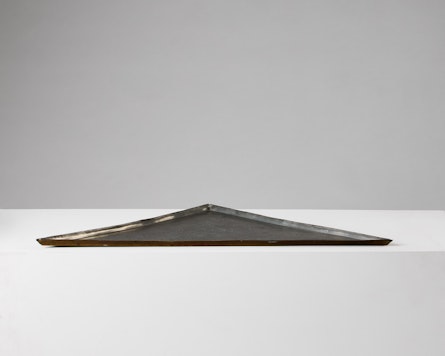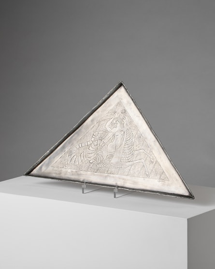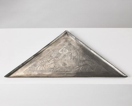 This early pewter tray by Anna Petrus, created in Stockholm around 1922–24, is a rare example of Swedish metalwork from the period leading up to the Swedish Grace movement. Executed in pewter with an underlying brass support, the triangular tray features a finely chiseled and punched decoration depicting a mermaid riding a fantastical creature. The detailed engraving reveals Petrus’ sculptural precision and her distinctive ability to merge classical motifs with the emerging modernist aesthetics of the early 20th century. The work is signed A. Petrus.