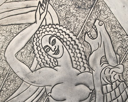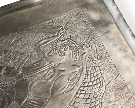 The tray embodies the refinement and craftsmanship that define Scandinavian decorative arts of the 1920s. The elegant interplay between pewter and brass highlights Petrus’ innovative approach to materials, which would later shape her collaborations with Firma Svenskt Tenn. With its mythological imagery, strong graphic quality, and collectible provenance, this tray represents a significant piece of Nordic design history. Wear and minor tears are present at the corners, consistent with its age.