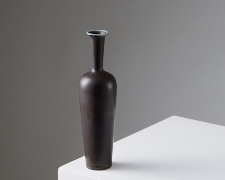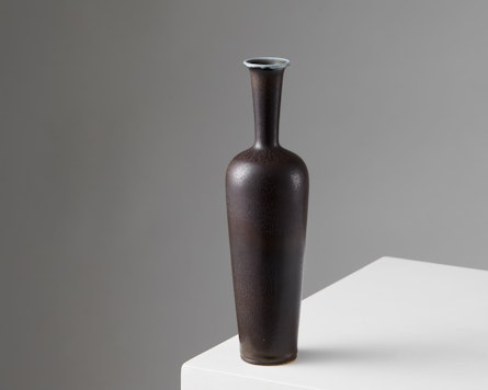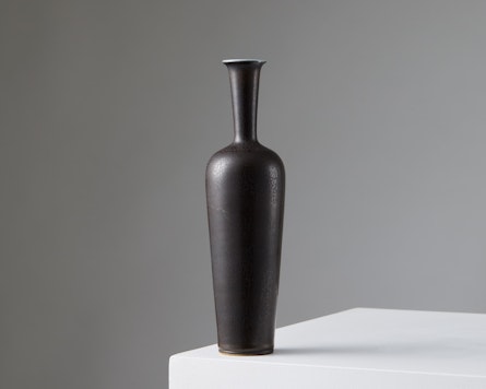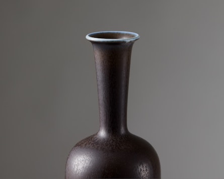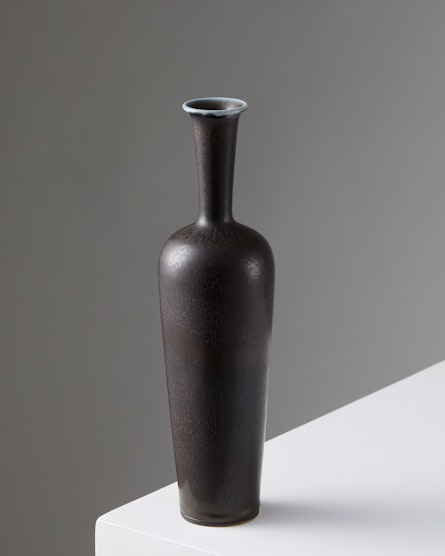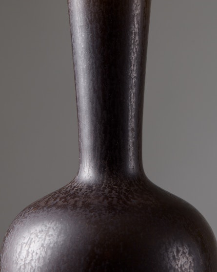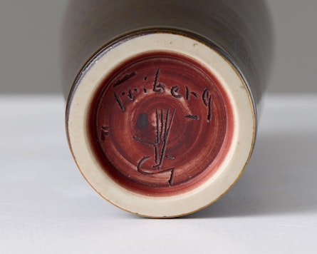 Stoneware with brown hare’s fur glaze and subtle blue rim. The elongated, slender form showcases Friberg’s exceptional command of proportion and balance, with a softly flaring neck that enhances the vessel’s graceful verticality.